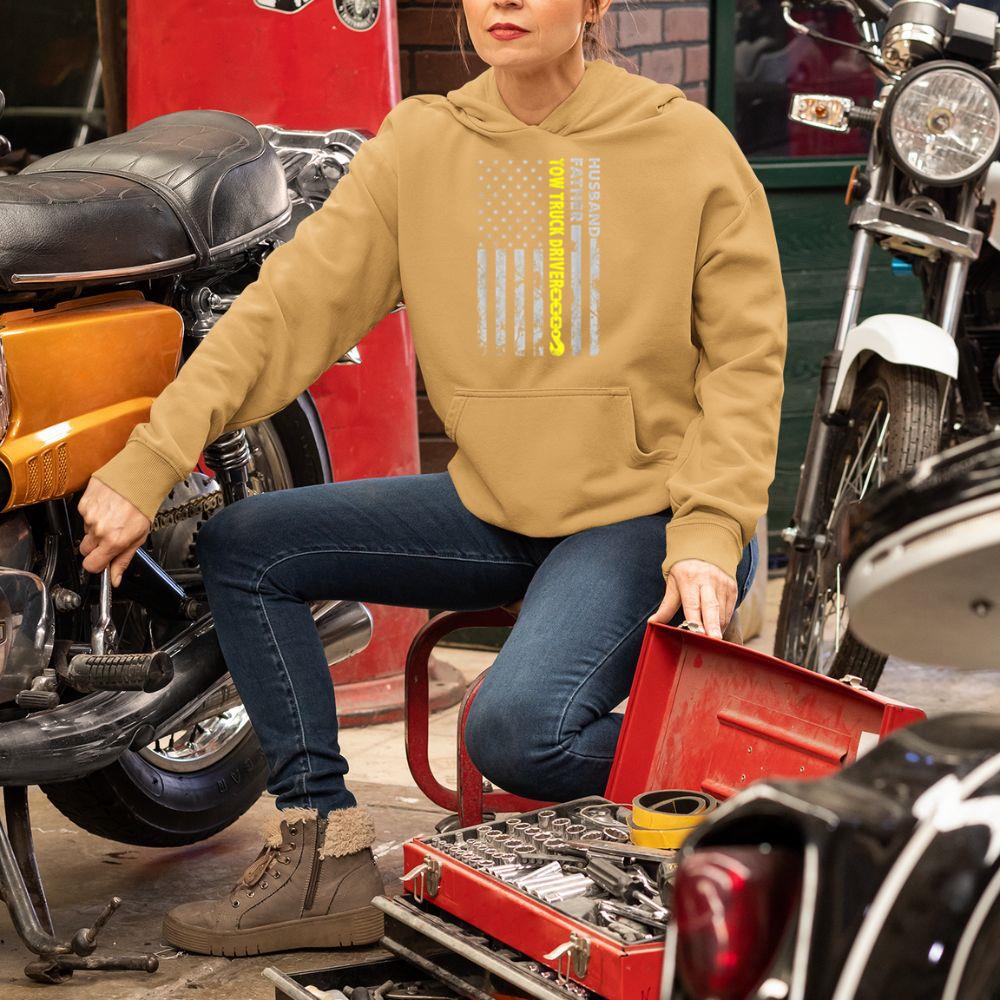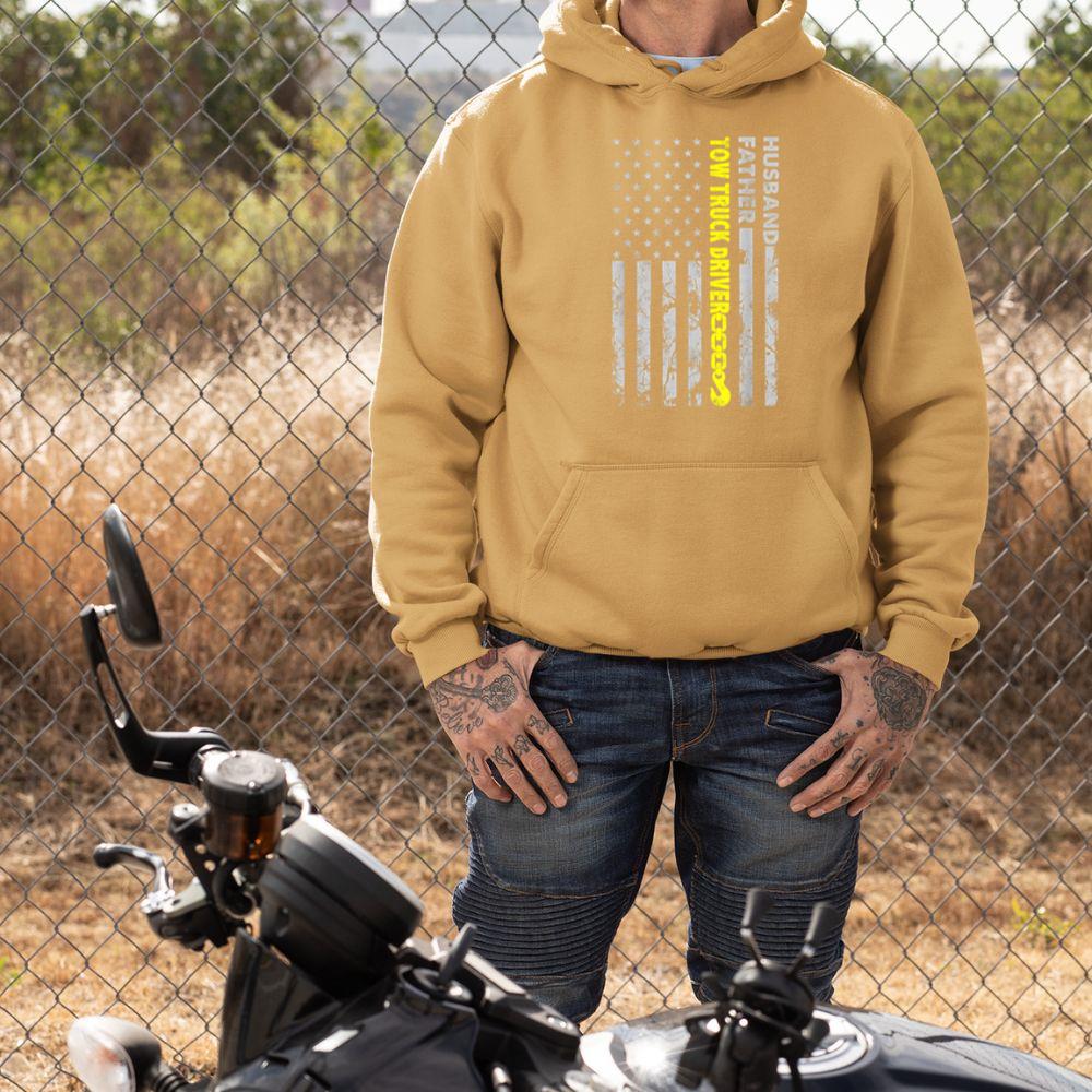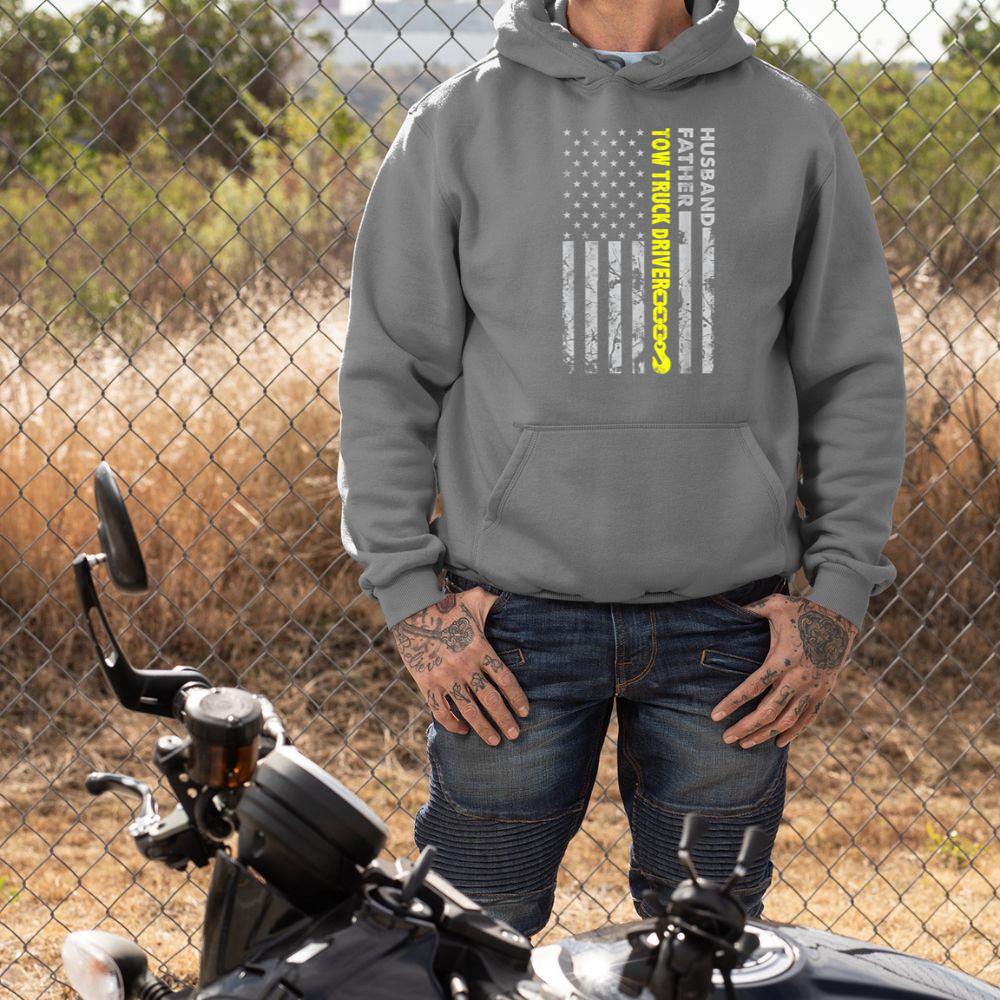Thebestfathersonsmatchingshirts Husband Father Tow Truck Driver American flag Towing Dad Unisex Hoodie