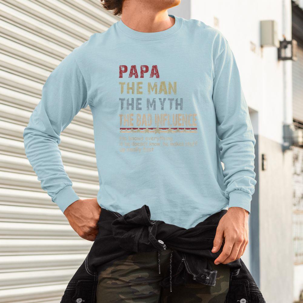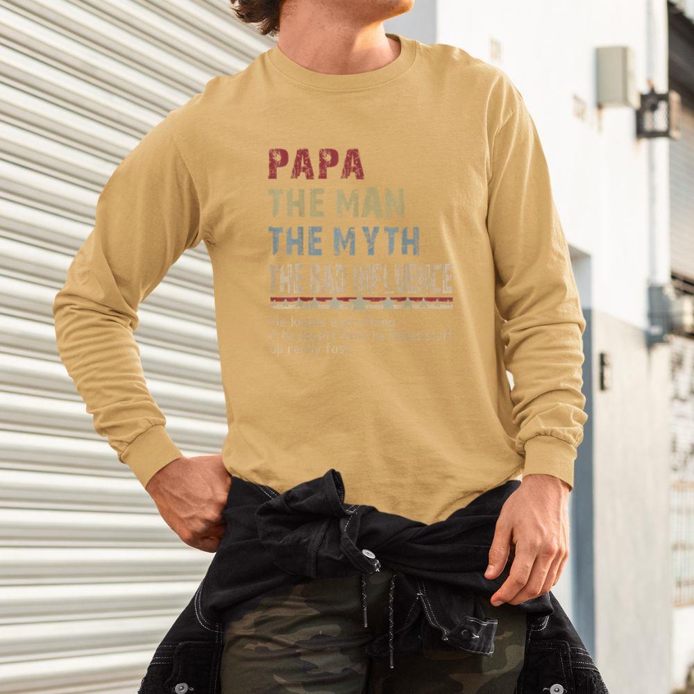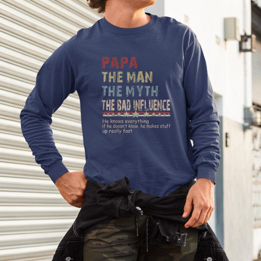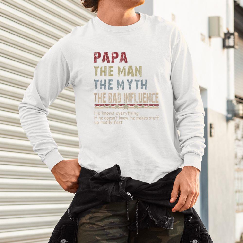 Thebestfathersonsmatchingshirts Papa The Man The Myth The Bad Influence Shirt Fathers Day Unisex Long Sleeve